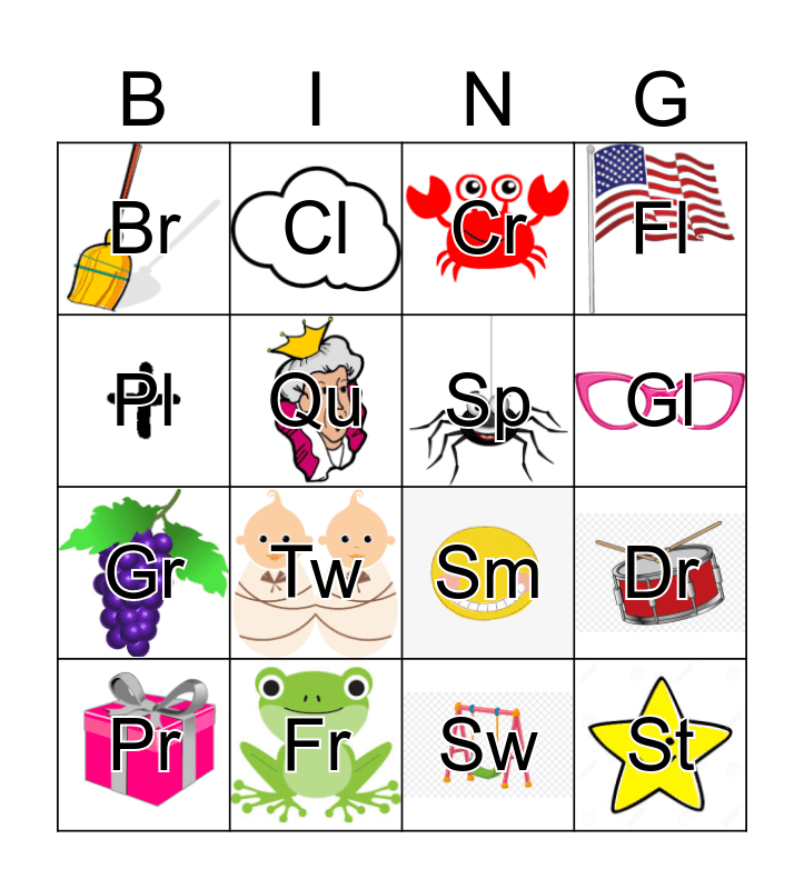 This bingo card has 19 images and 19 words: Sm, Bl, Cr, St, Dr, Pl, Sw, Br, Cl, Gr, Tw, Qu, Sp, Fr, Pr, Sn, Fl, Gl and Sl.