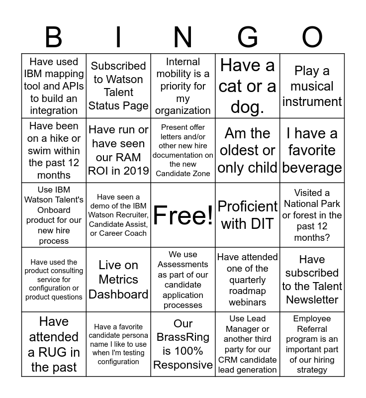 This bingo card has a free space and 24 words: Live on Metrics Dashboard, Have a favorite candidate persona name I like to use when I'm testing configuration, Present offer letters and/or other new hire documentation on the new Candidate Zone, Have attended a RUG in the past, Play a musical instrument, Have used IBM mapping tool and APIs to build an integration, Have been on a hike or swim within the past 12 months, Subscribed to Watson Talent Status Page, Proficient with DIT, We use Assessments as part of our candidate application processes, Am the oldest or only child, Use IBM Watson Talent's Onboard product for our new hire process, Have attended one of the quarterly roadmap webinars, Have subscribed to the Talent Newsletter, Have run or have seen our RAM ROI in 2019, Use Lead Manager or another third party for our CRM candidate lead generation, Visited a National Park or forest in the past 12 months?, Internal mobility is a priority for my organization, I have a favorite beverage, Have seen a demo of the IBM Watson Recruiter, Candidate Assist, or Career Coach, Employee Referral program is an important part of our hiring strategy, Have used the product consulting service for configuration or product questions, Have a cat or a dog. and Our BrassRing is 100% Responsive.