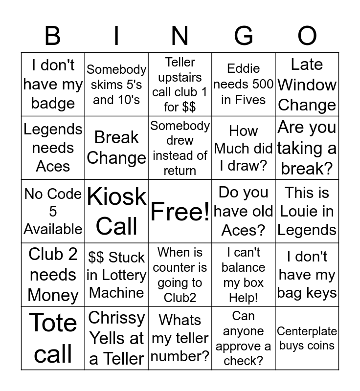 This bingo card has a free space and 24 words: $$ Stuck in Lottery Machine, Chrissy Yells at a Teller, Somebody drew instead of return, Tote call, Late Window Change, I don't have my badge, Legends needs Aces, Somebody skims 5's and 10's, Do you have old Aces?, When is counter is going to Club2, How Much did I draw?, No Code 5 Available, I can't balance my box Help!, I don't have my bag keys, Break Change, Can anyone approve a check?, This is Louie in Legends, Teller upstairs call club 1 for $$, Are you taking a break?, Kiosk Call, Centerplate buys coins, Club 2 needs Money, Eddie needs 500 in Fives and Whats my teller number?.