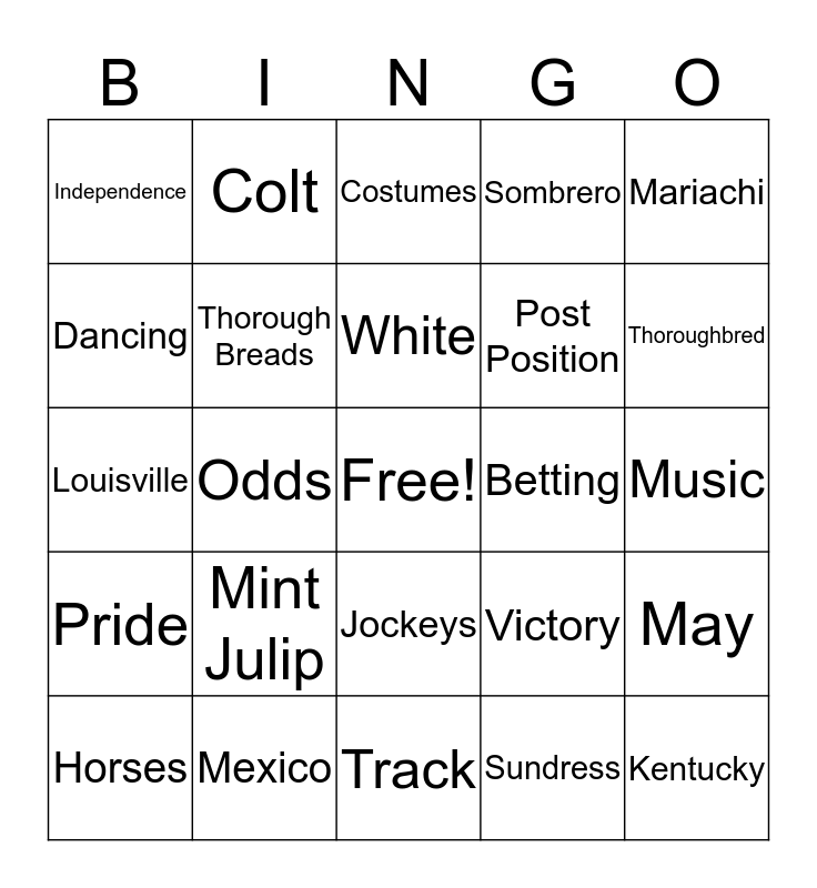 This bingo card has a free space and 44 words: Cinco de Mayo, Kentucky, Derby, Horses, Roses, Sundress, Costumes, Fiesta, Mariachi, Mexico, Sombrero, Betting, Jockeys, Mint Julip, Race, Track, Winners, Louisville, Churchill Downs, Thoroughbred, Colt, Stables, Comida, Independence, Celebration, Music, General Zaragoza, Hats, Victory, Pride, Crowds, May, Trophy, Triple Crown, Odds, Puebla, Red, Green, White, Dancing, Post Position, Louisville, Thorough Breads and May 5.