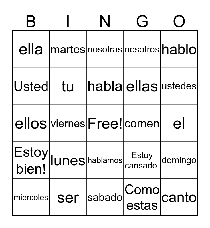 This bingo card has a free space and 26 words: hablamos, Como estas, habla, ser, hablo, ella, Usted, martes, el, Estoy cansado., ellas, ellos, domingo, miercoles, viernes, yo, nosotros, Estoy bien!, nosotras, canto, ustedes, sabado, comen, lunes, tu and jueves.