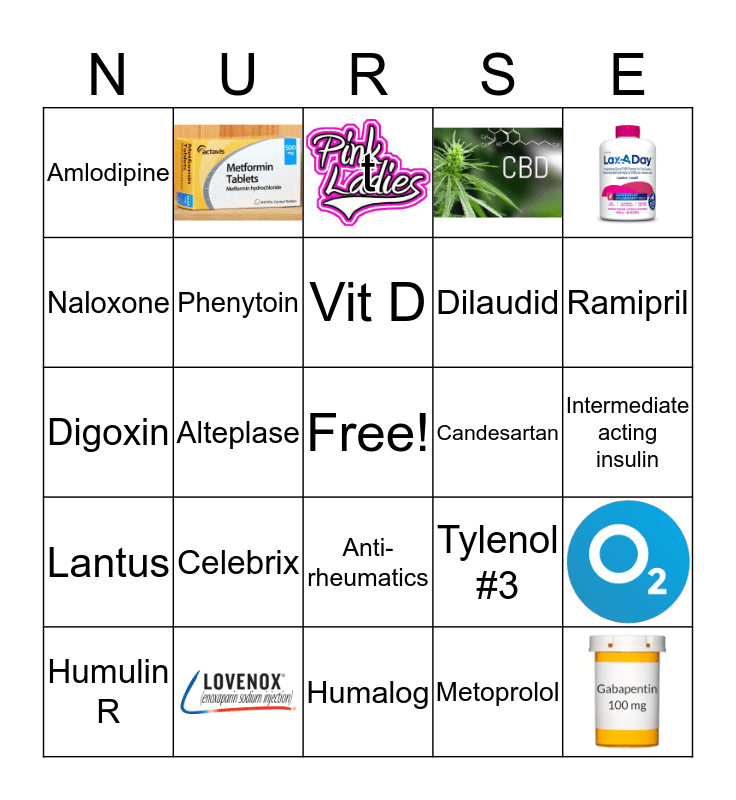 This bingo card has 9 images, a free space and 21 words: Humulin R, Alteplase, Salbutamol, Amlodipine, t, Phenytoin, Celebrix, Candesartan, Intermediate acting insulin, Humalog, Metoprolol, Ramipril, Budesonide, Anti-rheumatics, Lantus, Digoxin, Tylenol #3, Dilaudid, Naloxone, Vit D and Methadone.
