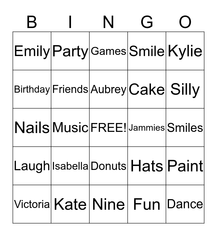This bingo card has a free space and 24 words: Isabella, Kate, Aubrey, Victoria, Kylie, Emily, Birthday, Party, Jammies, Donuts, Cake, Nails, Hats, Paint, Friends, Fun, Smiles, Games, Silly, Music, Dance, Laugh, Smile and Nine.