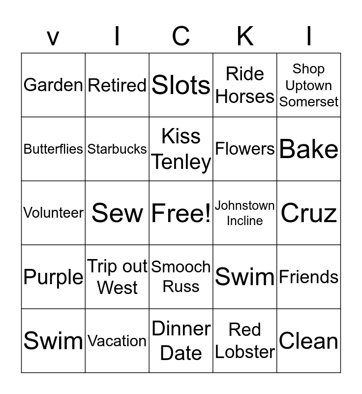 This bingo card has a free space and 29 words: Swim, Paint, Sew, Read, Garden, Slots, Starbucks, Trip out West, Johnstown Incline, Vacation, Cruz, Clean, Dinner Date, Red Lobster, Bake, Family Time, Smooch Russ, Purple, Shop Uptown Somerset, Volunteer, Swim, Exercise, Flowers, Butterflies, Ride Horses, Retired, Friends, Kiss Tenley and Hug Gabe.