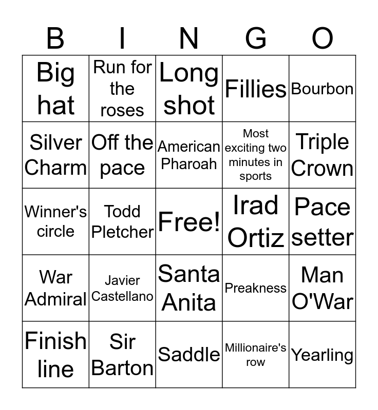 This bingo card has a free space and 76 words: Backstretch, First Saturday in May, Long shot, Jockey silks, Starting gate, Allowance, Twin spires, Garland of Roses, Seattle Slew, Secretariat, Winning Colors, Aristides, American Pharoah, Silver Charm, Bob Baffert, Todd Pletcher, D. Wayne Lukas, Yearling, Three-year-old, Bourbon, Mile-and-a-quarter, Winner's circle, Off the pace, Run for the roses, Fillies, 1875, Colts, Jockey, Handicap, In the gate, And they're off, Photo finish, Belmont, Preakness, Triple Crown, Most exciting two minutes in sports, Infield, My Old Kentucky Home, Pace setter, Millionaire's row, Furlong, Exacta, Superfecta, Trifecta, Paddock, Morning line, Finish line, Big hat, Takes the lead, On the rail, Wide around the turn, Santa Anita, Rider's up!, Mint julep, Kentucky Oaks, Call to the post, Justify, Sire, Barbaro, Affirmed, Javier Castellano, Pat Day, Joel Rosario, Mike Smith, Arkansas Derby, Louisiana Derby, Irad Ortiz, UAE Derby, Wood Memorial, Mine That Bird, Man O'War, War Admiral, Sir Barton, Blinkers, Saddle and Stirrups.