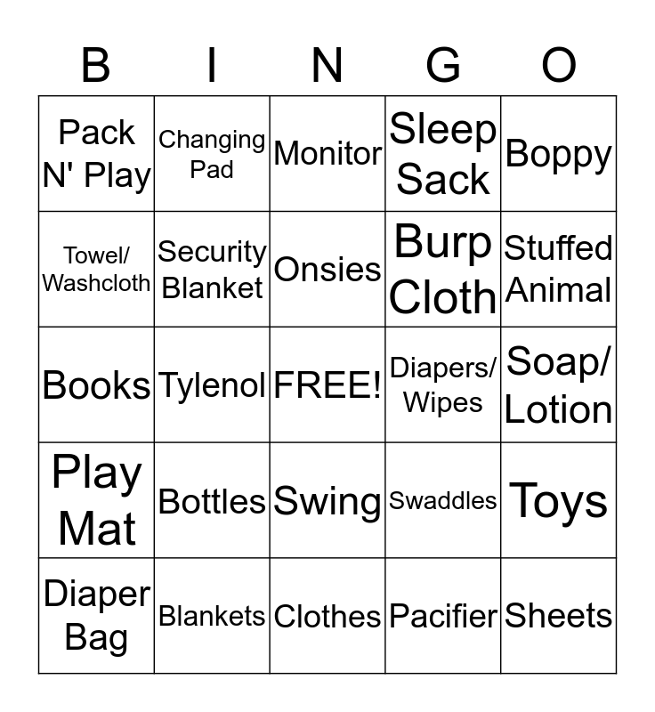 This bingo card has a free space and 24 words: Bottles, Blankets, Onsies, Diaper Bag, Boppy, Pack N' Play, Towel/ Washcloth, Changing Pad, Diapers/ Wipes, Swing, Burp Cloth, Books, Swaddles, Toys, Security Blanket, Pacifier, Soap/ Lotion, Monitor, Stuffed Animal, Tylenol, Sheets, Play Mat, Sleep Sack and Clothes.