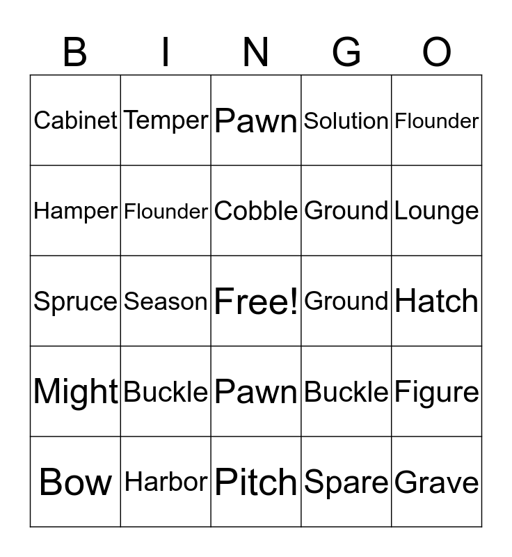 This bingo card has a free space and 29 words: Bow, Lean, Season, Sentence, Cabinet, Pawn, Flounder, Buckle, Ground, Harbor, Hatch, Grave, Pitch, Spare, Lounge, Page, Pawn, Might, Flounder, Spruce, Buckle, Coach, Ground, Hamper, Solution, Temper, Figure, Cobble and Periodic.