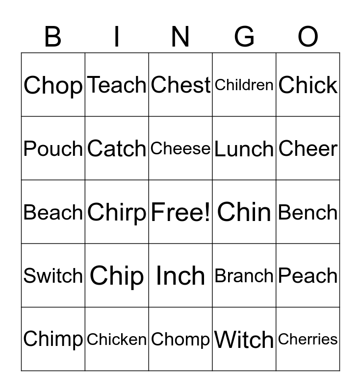 This bingo card has a free space and 24 words: Chip, Chicken, Cheese, Chimp, Chick, Chop, Pouch, Teach, Chin, Inch, Lunch, Beach, Branch, Peach, Catch, Witch, Bench, Chest, Cheer, Chirp, Cherries, Switch, Children and Chomp.