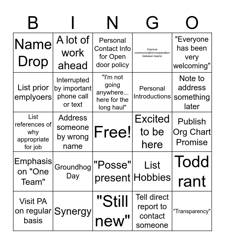 This bingo card has a free space and 24 words: Groundhog Day, Synergy, "I'm not going anywhere... here for the long haul", Visit PA on regular basis, "Everyone has been very welcoming", Name Drop, List prior emplyoers, A lot of work ahead, Excited to be here, "Posse" present, Personal Introductions, List references of why appropriate for job, List Hobbies, Todd rant, Interrupted by important phone call or text, Tell direct report to contact someone, Publish Org Chart Promise, Personal Contact Info for Open door policy, Note to address something later, Address someone by wrong name, "Transparency", Emphasis on "One Team", Improve communication/cooperation between teams and "Still new".