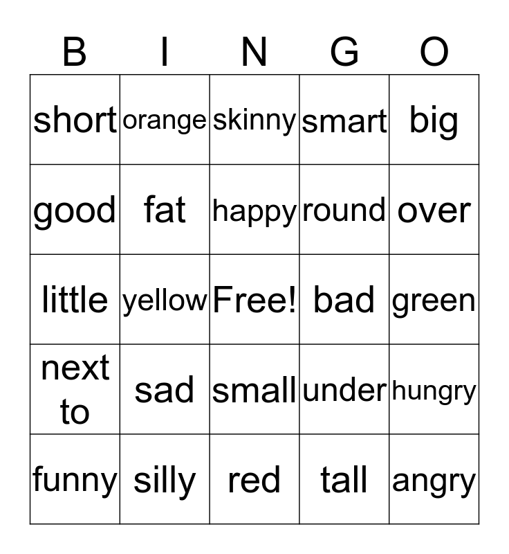 This bingo card has a free space and 24 words: funny, sad, happy, tall, big, short, orange, skinny, bad, green, little, fat, under, hungry, good, silly, red, smart, over, next to, yellow, small, round and angry.