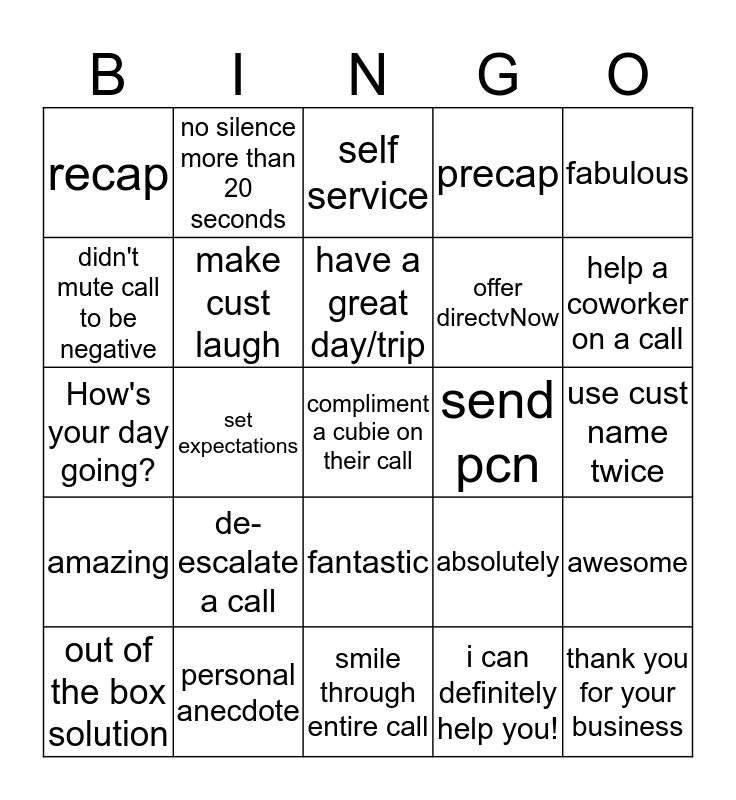 This bingo card has 30 words: personal anecdote, empathy statement, set expectations, personalize, recap, self service, make cust laugh, fantastic, send pcn, smile through entire call, use cust name twice, compliment a cubie on their call, i can definitely help you!, thank you for your business, help a coworker on a call, non-related offer, absolutely, amazing, de-escalate a call, fabulous, How's your day going?, use resolved statement, no silence more than 20 seconds, offer directvNow, didn't mute call to be negative, precap, awesome, out of the box solution, have a great day/trip and it's been my pleasure.