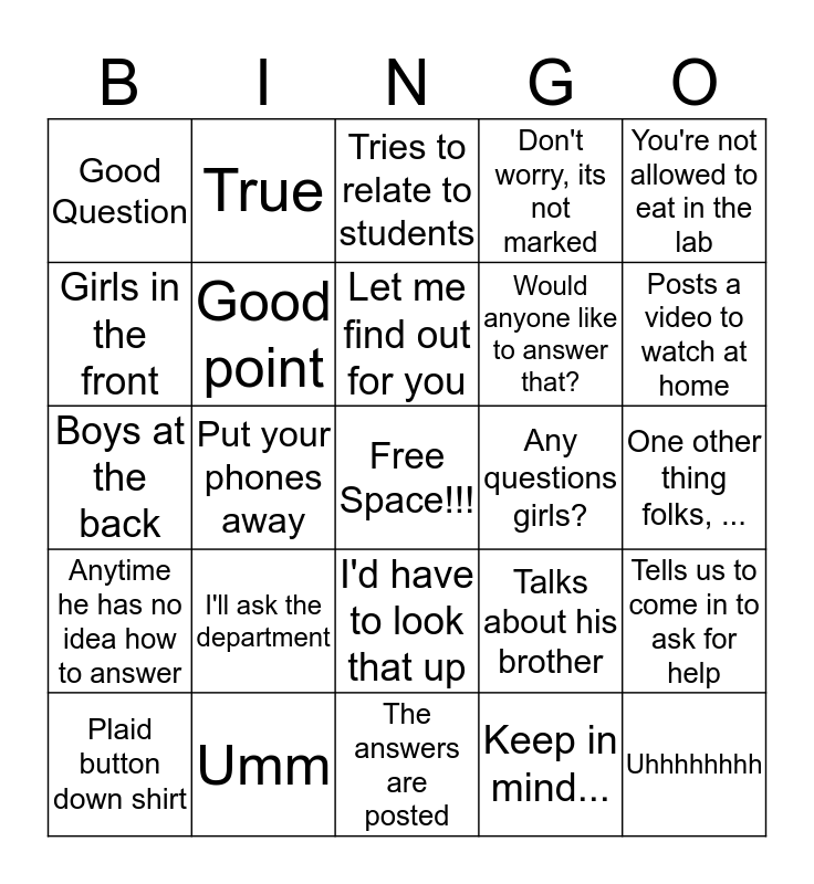 This bingo card has a free space and 24 words: I'll ask the department, Umm, Let me find out for you, Plaid button down shirt, You're not allowed to eat in the lab, Good Question, Girls in the front, True, Any questions girls?, I'd have to look that up, Would anyone like to answer that?, Boys at the back, Talks about his brother, Tells us to come in to ask for help, Good point, Keep in mind..., One other thing folks, ..., Tries to relate to students, Posts a video to watch at home, Put your phones away, Uhhhhhhhh, Anytime he has no idea how to answer, Don't worry, its not marked and The answers are posted.