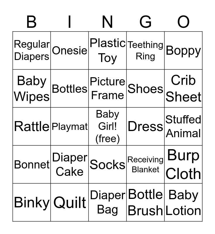 This bingo card has a free space and 24 words: Diaper Cake, Quilt, Picture Frame, Binky, Boppy, Regular Diapers, Baby Wipes, Onesie, Dress, Socks, Shoes, Rattle, Receiving Blanket, Burp Cloth, Bottles, Bottle Brush, Stuffed Animal, Plastic Toy, Crib Sheet, Playmat, Baby Lotion, Bonnet, Teething Ring and Diaper Bag.