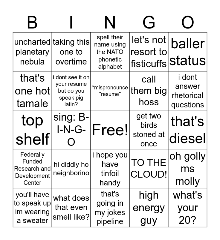 This bingo card has a free space and 24 words: hi diddly ho neighborino, what does that even smell like?, *mispronounce "resume", you'll have to speak up im wearing a sweater, baller status, uncharted planetary nebula, that's one hot tamale, taking this one to overtime, get two birds stoned at once, i hope you have tinfoil handy, call them big hoss, top shelf, TO THE CLOUD!, oh golly ms molly, i dont see it on your resume but do you speak pig latin?, high energy guy, that's diesel, spell their name using the NATO phonetic alphabet, i dont answer rhetorical questions, sing: B-I-N-G-O, what's your 20?, Federally Funded Research and Development Center, let's not resort to fisticuffs and that's going in my jokes pipeline.