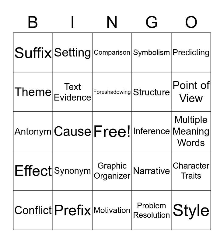 This bingo card has a free space and 24 words: Synonym, Prefix, Foreshadowing, Conflict, Predicting, Suffix, Theme, Setting, Inference, Graphic Organizer, Structure, Antonym, Narrative, Character Traits, Text Evidence, Problem Resolution, Multiple Meaning Words, Comparison, Point of View, Cause, Style, Effect, Symbolism and Motivation.