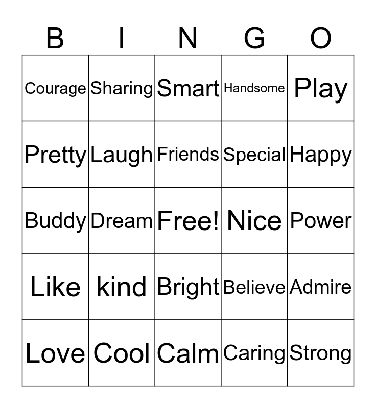 This bingo card has a free space and 24 words: kind, Cool, Friends, Love, Play, Courage, Pretty, Sharing, Nice, Bright, Special, Buddy, Believe, Admire, Laugh, Caring, Power, Smart, Happy, Dream, Strong, Like, Handsome and Calm.