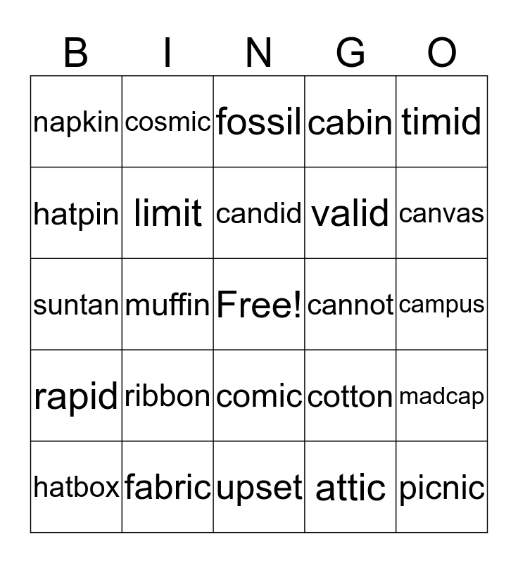 This bingo card has a free space and 60 words: admit, fabric, rabbit, rapid, attic, tidbit, limit, satin, valid, axis, cabin, catnip, hatpin, atlas, panic, napkin, picnic, timid, zigzag, candid, cannot, fossil, hatbox, madcap, mishap, robin, avid, bobbin, canvas, catnap, tactic, mimic, comma, tonsil, cosmic, until, sunup, muffin, rustic, suntan, public, ribbon, campus, hiccup, cotton, habit, submit, summit, vivid, comic, upset, exit, septic, sadden, panel, hectic, helmet, hidden, denim and puppet.