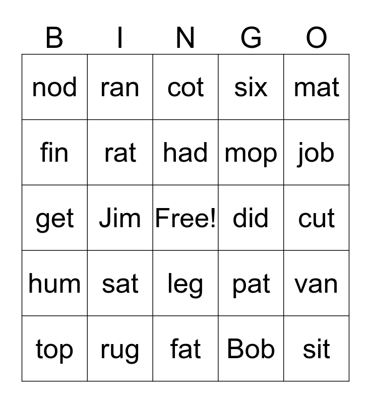 This bingo card has a free space and 51 words: map, sit, lap, fat, sat, lip, ran, sad, fin, lid, rat, six, van, pat, can, him, had, did, his, mat, Jim, Bob, nod, mop, ham, cat, job, not, top, cot, got, pat, run, us, fan, rug, but, cap, bus, cup, cut, hum, hug, fed, men, lot, get, pet, pan, leg and jet.