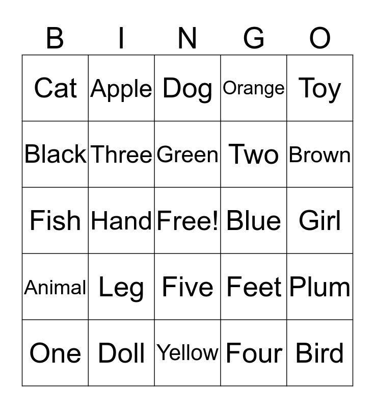 This bingo card has a free space and 29 words: One, Color, Hand, Rabbit, Cat, Dog, Three, Leg, Blue, Doll, Girl, Bird, Yellow, Four, Brown, Head, Five, Animal, Toy, Fish, Feet, Red, Two, Black, Orange, Apple, Plum, Green and Racoon.