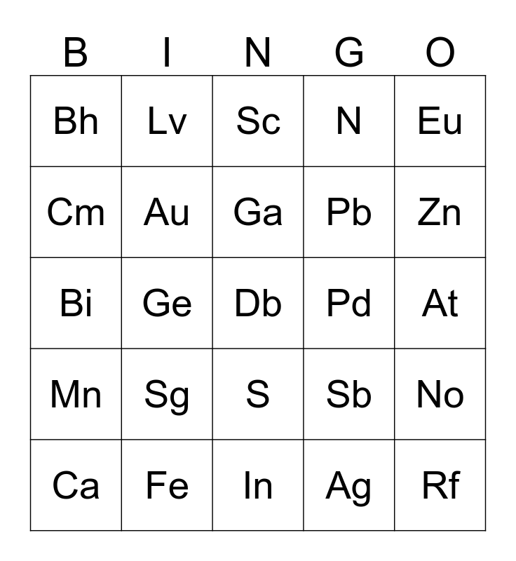This bingo card has 119 words: H, He, Li, Be, B, C, N, O, F, Ne, Na, Mg, Chemistry Free Space! :), Al, Si, P, S, Cl, Ar, K, Ca, Sc, Ti, V, Cr, Mn, Fe, Co, Ni, Cu, Zn, Ga, Ge, As, Se, Br, Kr, Rb, Sr, Y, Zr, Nb, Mo, Tc, Ru, Rh, Pd, Ag, Cd, In, Sn, Sb, Te, I, Xe, Cs, Ba, La, Hf, Ta, W, Re, Os, Ir, Pt, Au, Hg, Tl, Pb, Bi, Po, At, Rn, Fr, Ra, Ac, Rf, Db, Sg, Bh, Hs, Mt, Ds, Rg, Cn, Nh, Fl, Mc, Lv, Ts, Og, Ce, Pr, Nd, Pm, Sm, Eu, Gd, Tb, Dy, Ho, Er, Tm, Yb, Lu, Th, Pa, U, Np, Pu, Am, Cm, Bk, Cf, Es, Fm, Md, No and Lr.
