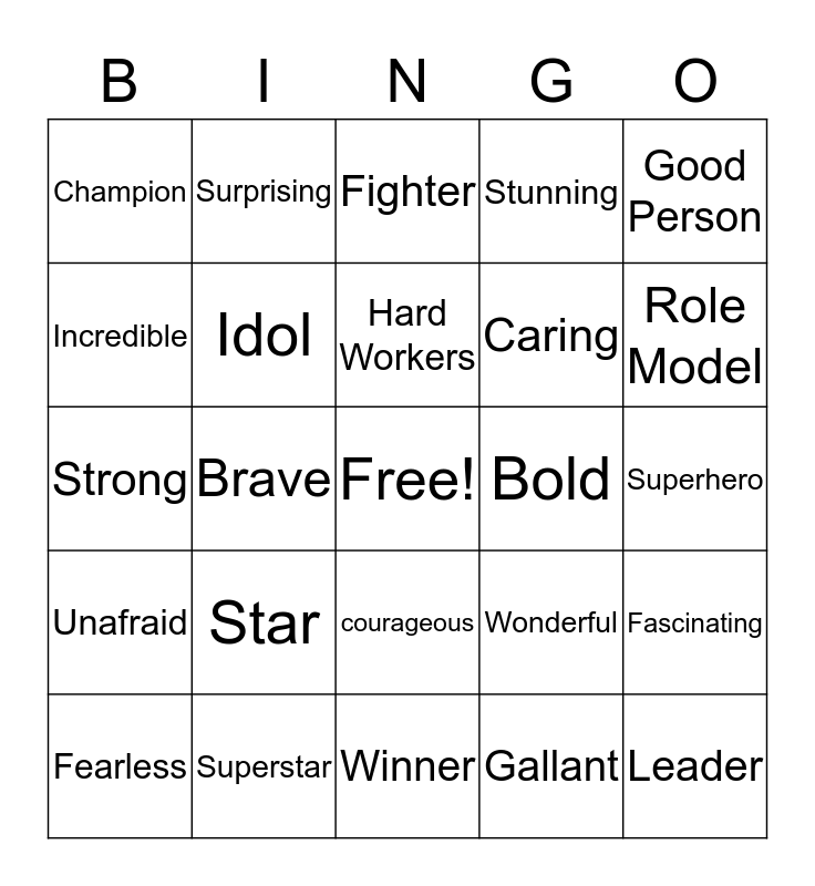 This bingo card has a free space and 29 words: Fearless, Daring, Brave, Epic, Champion, Fighter, Idol, Star, Bold, Superstar, Superhero, Leader, Winner, Gallant, Role Model, Thoughtful, courageous, Unafraid, Good Person, Strong, Wonderful, Amazing, Caring, Incredible, Stunning, Surprising, Fascinating, Hard Workers and Out-Standing.