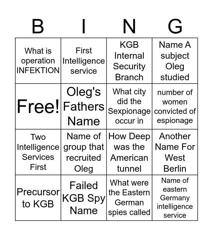 This bingo card has 16 words: Failed KGB Spy Name, Another Name For West Berlin, KGB Internal Security Branch, What is operation INFEKTION, Two Intelligence Services First, First Intelligence service, How Deep was the American tunnel, What were the Eastern German spies called, Free!, Oleg's Fathers Name, Precursor to KGB, Name A subject Oleg studied, Name of group that recruited Oleg, number of women convicted of espionage, What city did the Sexpionage occur in and Name of eastern Germany intelligence service.