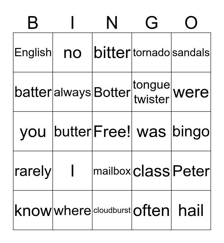 This bingo card has a free space and 34 words: thunderstorm, often, never, sometimes, rarely, always, sandals, know, no, Betty, Botter, bitter, fuzzy, bear, was, were, where, you, I, class, mailbox, spring, English, bingo, cloudburst, hail, tornado, party, tongue twister, batter, better, butter, Peter and peck.