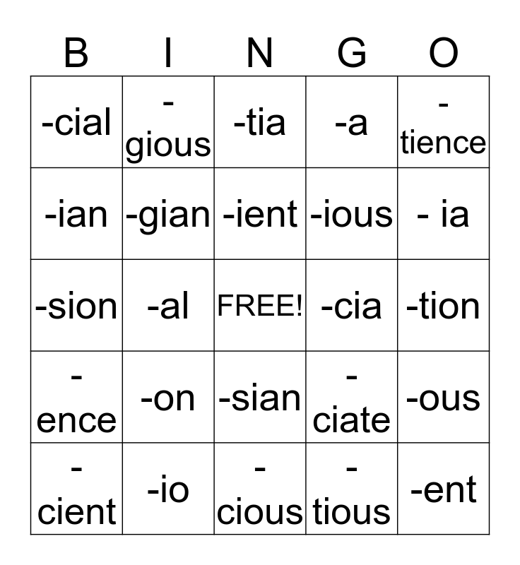 This bingo card has a free space and 24 words: -on, -io, -ient, -cient, -tience, -cial, -ian, -gious, -cia, -sian, -ious, -sion, -ciate, -ous, -gian, -tious, -tion, -tia, - ia, -al, -ent, -ence, -a and -cious.