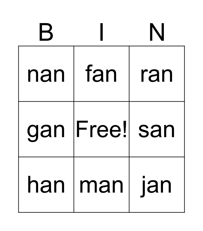 This bingo card has a free space and 14 words: tan, can, han, fan, gan, jan, kan, lan, man, nan, pan, san, ran and van.
