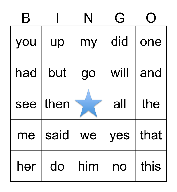 This bingo card has a free space and 29 words: her, to, then, some, you, my, but, said, all, do, the, this, him, no, and, am, we, me, one, see, yes, have, will, had, did, up, that, go and out.