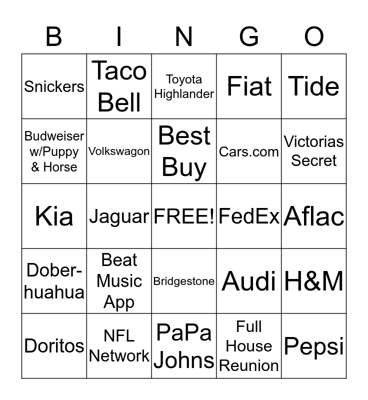 This bingo card has a free space and 24 words: Beat Music App, NFL Network, Best Buy, Doritos, Tide, Snickers, Budweiser w/Puppy & Horse, Taco Bell, FedEx, Bridgestone, Cars.com, Kia, Audi, H&M, Volkswagon, Full House Reunion, Aflac, Toyota Highlander, Victorias Secret, Jaguar, Pepsi, Dober-huahua, Fiat and PaPa Johns.
