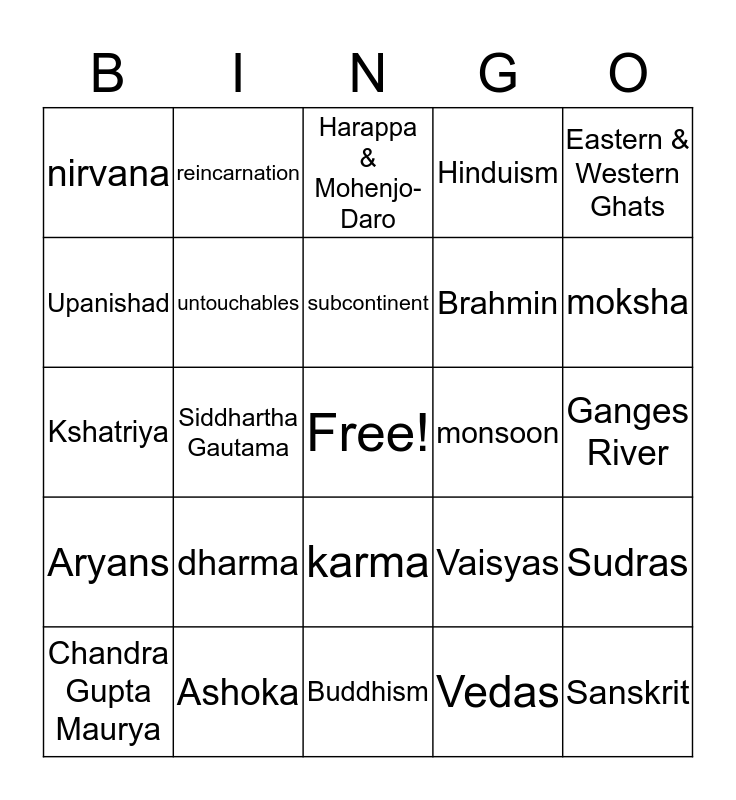 This bingo card has a free space and 24 words: dharma, Ashoka, subcontinent, Chandra Gupta Maurya, Eastern & Western Ghats, nirvana, Upanishad, reincarnation, monsoon, karma, Brahmin, Kshatriya, Vaisyas, Sudras, untouchables, Vedas, Ganges River, Harappa & Mohenjo-Daro, moksha, Siddhartha Gautama, Sanskrit, Aryans, Hinduism and Buddhism.