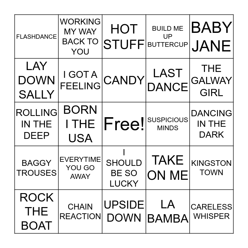 This bingo card has a free space and 40 words: BLACK MAGIC, ROLLING IN THE DEEP, CHASING CARS, I GOT A FEELING, CHAIN REACTION, I SHOULD BE SO LUCKY, CANDY, ALL RIGHT NOW, BABY JANE, BAGGY TROUSES, BORN I THE USA, BUILD ME UP BUTTERCUP, CARELESS WHISPER, DANCING IN THE DARK, SUSPICIOUS MINDS, EVERYTIME YOU GO AWAY, FEEL, FLASHDANCE, MY HEART WILL GO ON, HOT STUFF, KINGSTON TOWN, LA BAMBA, LAST DANCE, LAY DOWN SALLY, A MILLION LOVE SONGS, NEVER LET IT SLIP AWAY, NO MATTER WHAT, ONE LAST TIME, ONE MAN BAND, POSTMAN PAT, RIDE ON, ROCK THE BOAT, SUMMER HOLIDAY, TAKE ON ME, THE GALWAY GIRL, UPSIDE DOWN, THE WALK OF LIFE, WHEN THE GOING GETS TOUGH, WORKING MY WAY BACK TO YOU and YOUR STILL THE ONE.
