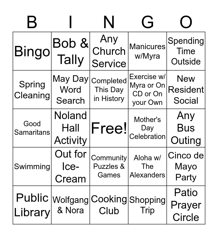 This bingo card has a free space and 33 words: Drum Circle, If you are a Mother or Had a Mother, Noland Hall Activity, Sips and Strokes, Swimming, May Day Word Search, Spending Time Outside, Public Library, Bob & Tally, Shopping Trip, Completed This Day in History, Any Church Service, Resident Council Meeting, Welcome a New Resident, Mother's Day Celebration, New Resident Social, Wolfgang & Nora, Good Samaritans, Out for Ice-Cream, Aloha w/ The Alexanders, Community Puzzles & Games, Game Time w/ Dannielle, Bingo, Any Bus Outing, Cooking Club, Patio Prayer Circle, Manicures w/Myra, Exercise w/ Myra or On CD or On your Own, Spring Cleaning, Cinco de Mayo Party, James & James Birthday Party, Shopping Trip and Cooking Club.