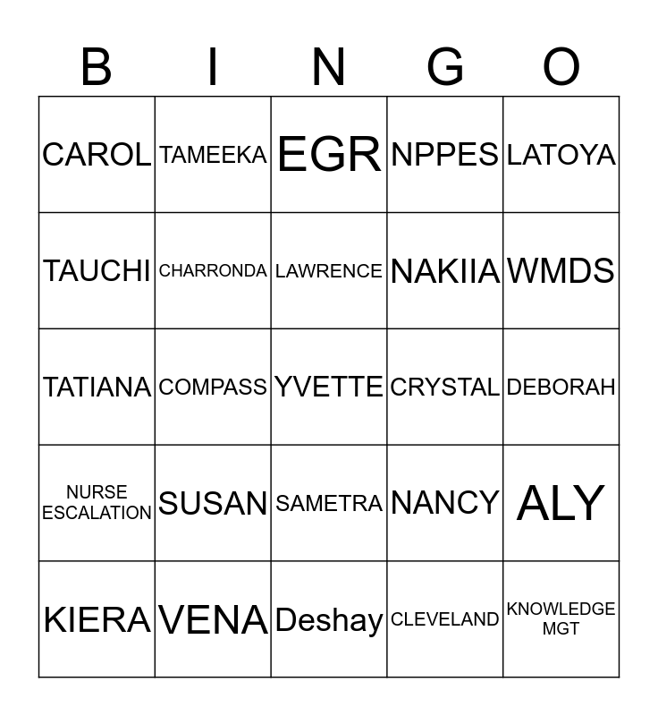 This bingo card has a free space and 24 words: SUSAN, VENA, LAWRENCE, KIERA, LATOYA, CAROL, TAUCHI, TAMEEKA, CRYSTAL, SAMETRA, NAKIIA, TATIANA, NANCY, ALY, CHARRONDA, CLEVELAND, DEBORAH, EGR, WMDS, COMPASS, KNOWLEDGE MGT, NURSE ESCALATION, NPPES and Deshay.