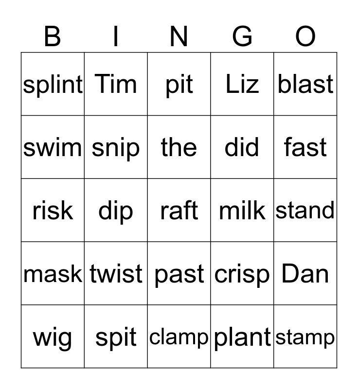 This bingo card has a free space and 29 words: wig, pin, dip, spin, splint, pit, snip, twist, milk, spit, stand, stamp, clamp, plant, fast, gap, past, mask, blast, risk, crisp, big, did, swim, Liz, Tim, Dan, the and cat.