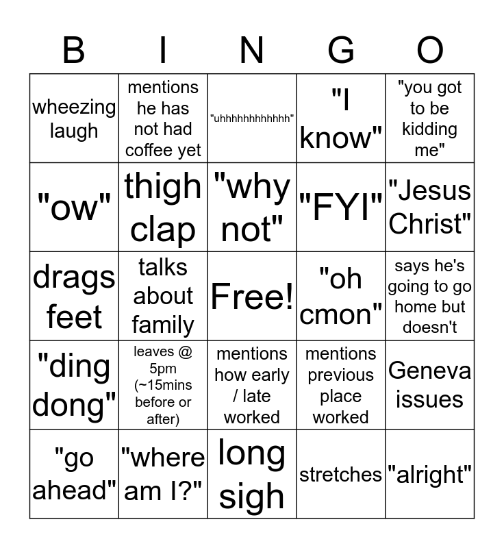 This bingo card has a free space and 24 words: leaves @ 5pm (~15mins before or after), "where am I?", "why not", "go ahead", "you got to be kidding me", wheezing laugh, "ow", mentions he has not had coffee yet, "oh cmon", mentions how early / late worked, "FYI", drags feet, mentions previous place worked, Geneva issues, thigh clap, stretches, says he's going to go home but doesn't, "uhhhhhhhhhhhh", "Jesus Christ", talks about family, "alright", "ding dong", "I know" and long sigh.