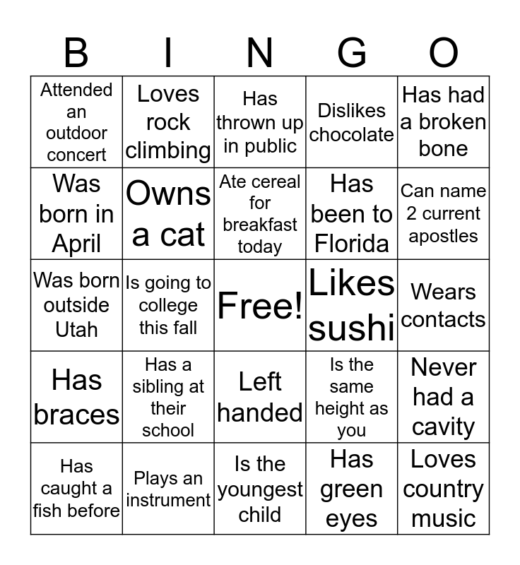 This bingo card has a free space and 29 words: Has caught a fish before, Will sing you their school song, Is going to college this fall, Has freckles, Attended an outdoor concert, Has thrown up in public, Owns a cat, Has a sibling at their school, Likes sushi, Plays an instrument, Wears contacts, Loves country music, Is the youngest child, Has green eyes, Can name 2 current apostles, Belongs to a sports team, Left handed, Has braces, Has had a broken bone, Was born outside Utah, Is the same height as you, Has 2 brothers, Has been to Florida, Was born in April, Dislikes chocolate, Loves rock climbing, Never had a cavity, Ate cereal for breakfast today and Will do a cartwheel right now.