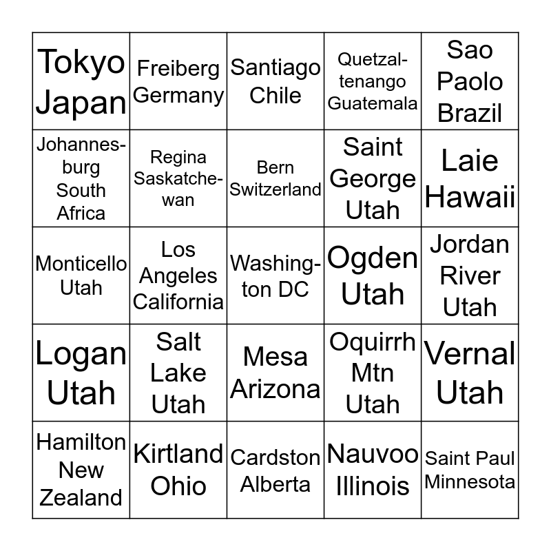 This bingo card has 25 words: Salt Lake Utah, Cardston Alberta, Bern Switzerland, Hamilton New Zealand, Sao Paolo Brazil, Tokyo Japan, Johannes-burg South Africa, Freiberg Germany, Ogden Utah, Mesa Arizona, Saint George Utah, Monticello Utah, Oquirrh Mtn Utah, Vernal Utah, Regina Saskatche-wan, Saint Paul Minnesota, Jordan River Utah, Santiago Chile, Laie Hawaii, Los Angeles California, Washing-ton DC, Kirtland Ohio, Logan Utah, Quetzal-tenango Guatemala and Nauvoo Illinois.