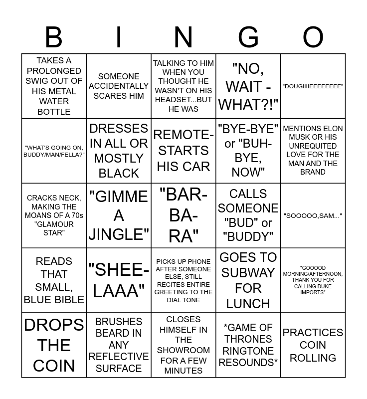 This bingo card has 25 words: "SHEE-LAAA", CLOSES HIMSELF IN THE SHOWROOM FOR A FEW MINUTES, REMOTE-STARTS HIS CAR, DROPS THE COIN, "DOUGIIIIEEEEEEEE", TAKES A PROLONGED SWIG OUT OF HIS METAL WATER BOTTLE, "WHAT'S GOING ON, BUDDY/MAN/FELLA?", SOMEONE ACCIDENTALLY SCARES HIM, CALLS SOMEONE "BUD" or "BUDDY", PICKS UP PHONE AFTER SOMEONE ELSE, STILL RECITES ENTIRE GREETING TO THE DIAL TONE, "BYE-BYE" or "BUH-BYE, NOW", CRACKS NECK, MAKING THE MOANS OF A 70s "GLAMOUR STAR", GOES TO SUBWAY FOR LUNCH, "GOOOOD MORNING/AFTERNOON, THANK YOU FOR CALLING DUKE IMPORTS", DRESSES IN ALL OR MOSTLY BLACK, PRACTICES COIN ROLLING, "SOOOOO,SAM...", TALKING TO HIM WHEN YOU THOUGHT HE WASN'T ON HIS HEADSET...BUT HE WAS, MENTIONS ELON MUSK OR HIS UNREQUITED LOVE FOR THE MAN AND THE BRAND, "GIMME A JINGLE", "BAR-BA-RA", BRUSHES BEARD IN ANY REFLECTIVE SURFACE, READS THAT SMALL, BLUE BIBLE, "NO, WAIT - WHAT?!" and *GAME OF THRONES RINGTONE RESOUNDS*.