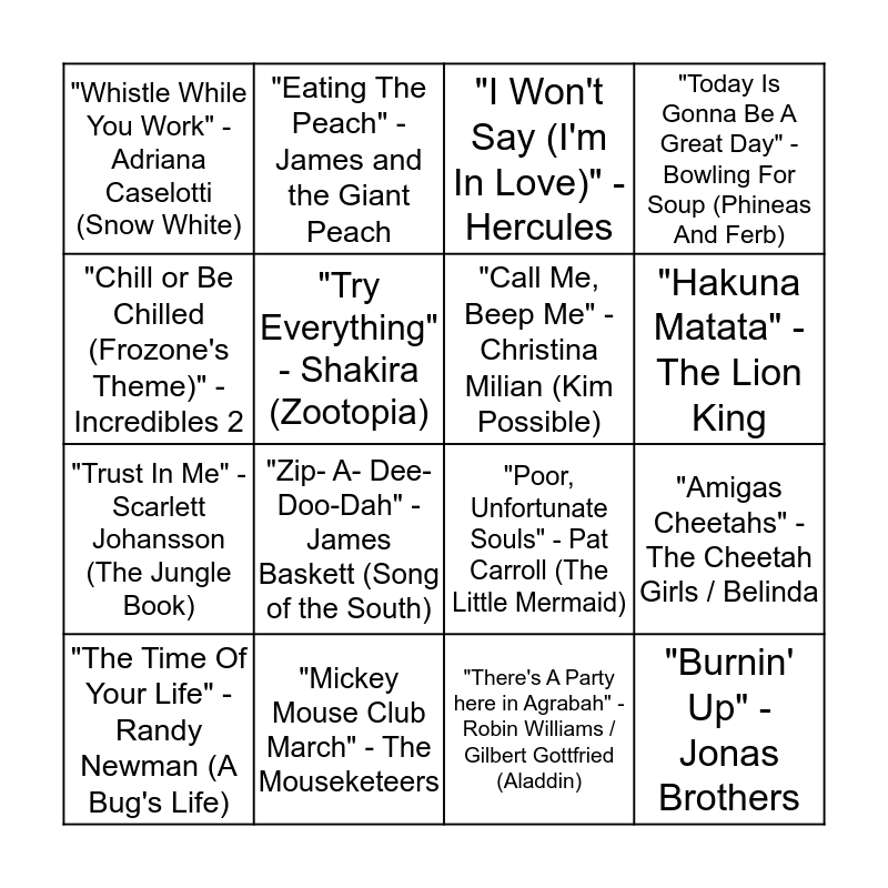 This bingo card has 32 words: "A Girl Worth Fighting For" - Mulan, "Ain't No Mountain High Enough" - Marvin Gaye, Tammi Terrell (Remember The Titans), "Amigas Cheetahs" - The Cheetah Girls / Belinda, "Breaking Free" - High School Musical, "Burnin' Up" - Jonas Brothers, "Call Me, Beep Me" - Christina Milian (Kim Possible), "Chill or Be Chilled (Frozone's Theme)" - Incredibles 2, "Chim Chum Cher-ee" - Mary Poppins, "Eating The Peach" - James and the Giant Peach, "For The First Time In Forever" - Kristen Bell / Idina Menzel (Frozen), "Hakuna Matata" - The Lion King, "I Won't Say (I'm In Love)" - Hercules, "Just Around the Riverbend" - Judy Kuhn (Pocahontas), "Lava" - James Ford Murphy, "Mickey Mouse Club March" - The Mouseketeers, "Once Upon A Dream" - Lana Del Rey (Maleficent), "Pink Elephants On Parade" - Dumbo, "Poor, Unfortunate Souls" - Pat Carroll (The Little Mermaid), "Reflection" - Christina Aguilera, "Shiver My Timbers" - Pirates of the Caribbean, "Something There" - Beauty & the Beast, "The Gospel Truth 1" - Hercules, "There's A Party here in Agrabah" - Robin Williams / Gilbert Gottfried (Aladdin), "There She Goes" - The La's (The Parent Trap), "The Time Of Your Life" - Randy Newman (A Bug's Life), "Today Is Gonna Be A Great Day" - Bowling For Soup (Phineas And Ferb), "Trust In Me" - Scarlett Johansson (The Jungle Book), "Try Everything" - Shakira (Zootopia), "Whistle While You Work" - Adriana Caselotti (Snow White), "You Might Think" - Weezer (The Cars), "You Sexy Thing" - Hot Chocolate (Heavyweights) and "Zip- A- Dee-Doo-Dah" - James Baskett (Song of the South).
