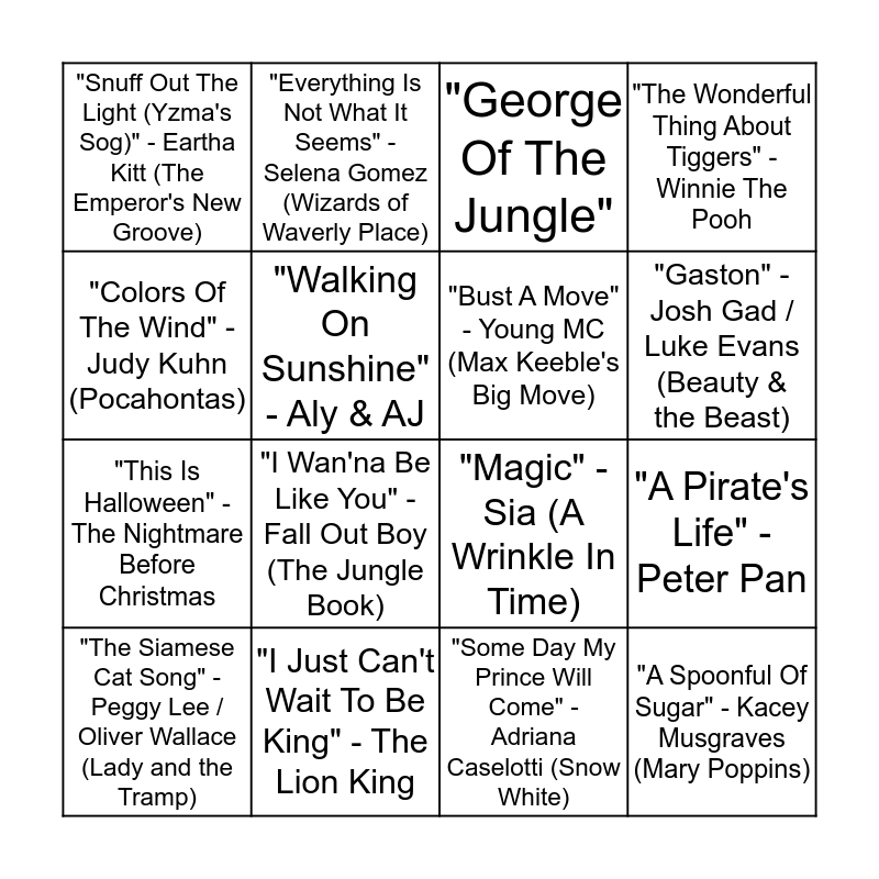 This bingo card has 33 words: "A Guy Like You" - The Hunchback of Notre Dame, "All Around The World (Punk Debutante)" - Cooler Kids (Lizzie McGuire Movie), "A Pirate's Life" - Peter Pan, "Arabian Nights" - Bruce Adler (Aladdin), "A Spoonful Of Sugar" - Kacey Musgraves (Mary Poppins), "Bust A Move" - Young MC (Max Keeble's Big Move), "Colors Of The Wind" - Judy Kuhn (Pocahontas), "Dig A Little Deeper" - Jenifer Lewis (The Princess and the Frog), "Everything Is Not What It Seems" - Selena Gomez (Wizards of Waverly Place), "Friends For Life" - One Flew South (Fox and The Hound 2), "Gaston" - Josh Gad / Luke Evans (Beauty & the Beast), "George Of The Jungle", "He Mele No Lilo" - Lilo & Stitch, "I Believe" - DJ Khaled / Demi Lovato (A Wrinkle In Time), "I Just Can't Wait To Be King" - The Lion King, "I Wan'na Be Like You" - Fall Out Boy (The Jungle Book), "Kiss The Girl" - Samuel E. Wright (The Little Mermaid), "Magic" - Sia (A Wrinkle In Time), "On The Open Road" - A Goofy Movie, "Real Gone" - Sheryl Crow (Cars), "Ride" - ZZ Ward / Gary Clark Jr. (Cars 3), "Shake Your Groove Thing" - Peaches & Herb (An Extremely Goofy Movie), "Snuff Out The Light (Yzma's Sog)" - Eartha Kitt (The Emperor's New Groove), "Some Day My Prince Will Come" - Adriana Caselotti (Snow White), "That's So Raven" - Raven-Symone, "The Siamese Cat Song" - Peggy Lee / Oliver Wallace (Lady and the Tramp), "The Wonderful Thing About Tiggers" - Winnie The Pooh, "This Is Halloween" - The Nightmare Before Christmas, "Walking On Sunshine" - Aly & AJ, "We Are The Champions" - Queen (The Mighty Ducks), "Woody's Roundup" - Riders In The Sky (Toy Story 2), "You're Welcome" - Dwayne Johnson (Moana) and "Zero" - Imagine Dragons (Ralph Breaks The Internet).