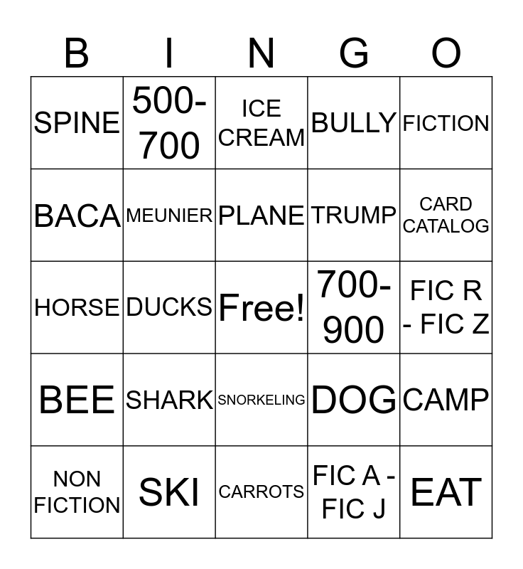 This bingo card has a free space and 24 words: SHARK, SKI, PLANE, NON FICTION, FICTION, SPINE, BACA, 500-700, 700-900, SNORKELING, TRUMP, HORSE, DOG, CAMP, MEUNIER, FIC A - FIC J, FIC R - FIC Z, ICE CREAM, CARD CATALOG, DUCKS, EAT, BEE, BULLY and CARROTS.