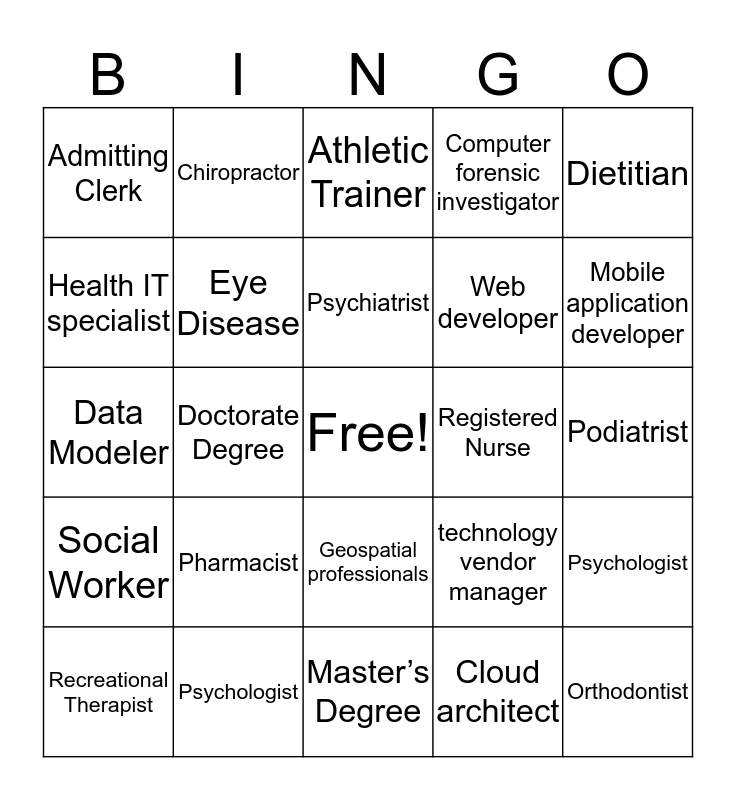 This bingo card has a free space and 29 words: Recreational Therapist, Medical Coder, Doctorate Degree, Drug Rehab Center, Admitting Clerk, Athletic Trainer, Eye Disease, Pharmacist, Registered Nurse, Psychologist, Podiatrist, Orthodontist, Master’s Degree, Cloud architect, Mobile application developer, Software engineer, Geospatial professionals, Social Worker, Dietitian, Data Modeler, technology vendor manager, Software engineer, Web developer, Health IT specialist, Computer forensic investigator, Chiropractor, Psychologist, Psychiatrist and Phlebotomist.
