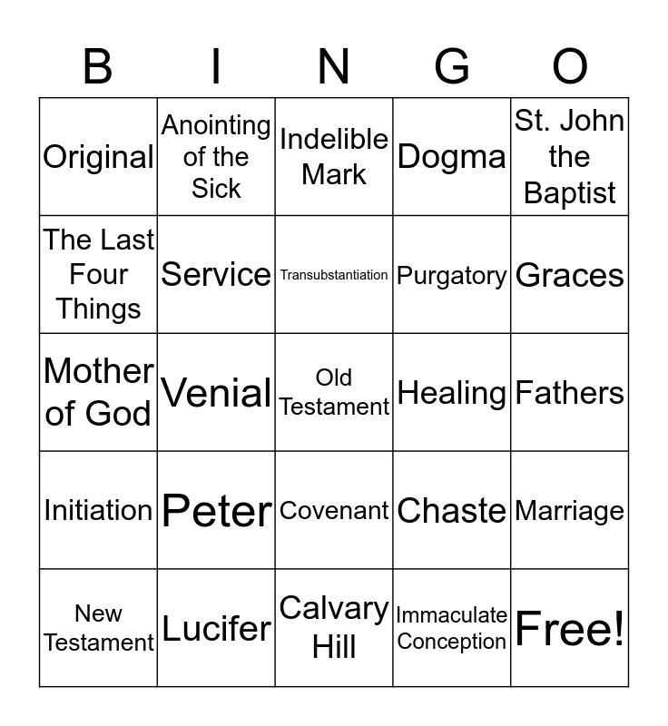 This bingo card has 31 words: Calvary Hill, Bride, Venial, In Persona Christi, Original, Indelible Mark, Service, Chaste, Healing, Immaculate Conception, Fathers, Old Testament, Free!, Annulment, Graces, Mary, Marriage, Peter, Initiation, Covenant, St. John the Baptist, Holy Spirit, New Testament, Anointing of the Sick, Purgatory, The Last Four Things, Dogma, Mother of God, Lucifer, Transubstantiation and Gifts.