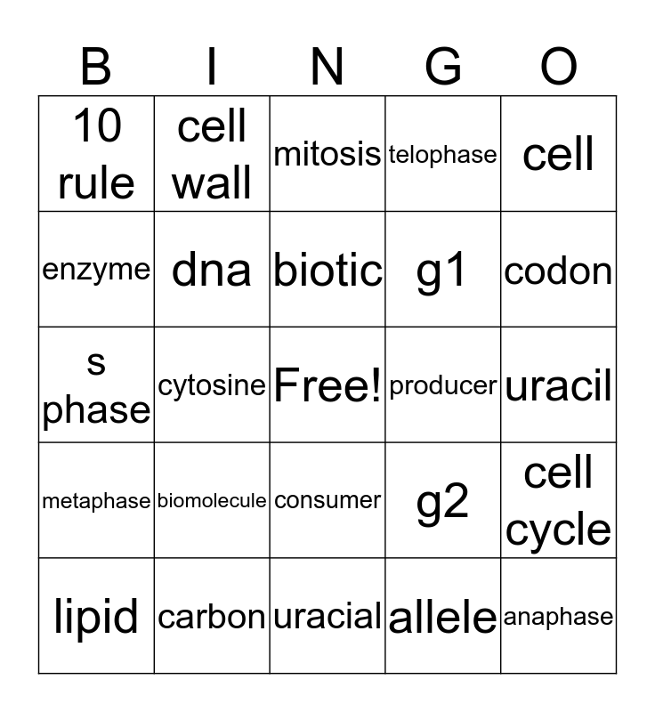 This bingo card has a free space and 24 words: biomolecule, carbon, biotic, lipid, cell, 10 rule, enzyme, cell wall, producer, consumer, g1, s phase, g2, cell cycle, dna, allele, uracil, mitosis, codon, cytosine, anaphase, metaphase, telophase and uracial.