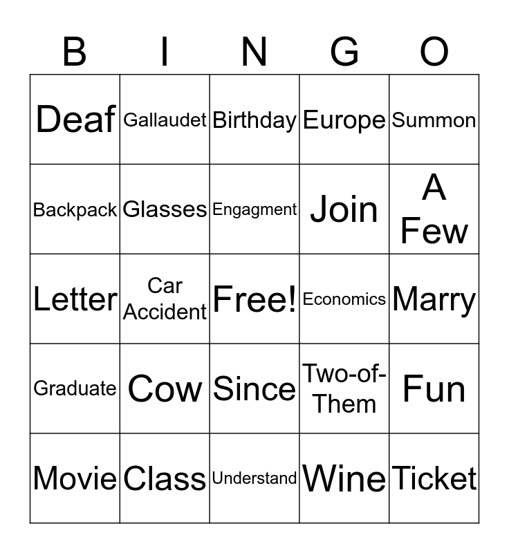 This bingo card has a free space and 64 words: Lunch, Hammer, Copy, Fun, Magazine, Interpret, Gallaudet, Californa, Engagment, Summer, Since, Teacher, Marry, Summon, Chicago, Backpack, Car Accident, Deaf, Hamburger, Join, Cow, Graduate, Europe, Take Pill, Funny, Aunt, Finish, Spring, Shy, Yesterday, Friday, Learn, Yellow, Sick, A Few, Movie, Grandma, Wine, Sentence, Glasses, Letter, Economics, Cookie, College, French Fry, Ticket, Class, Fingerspell, Two-of-Them, #Bus, Test, Internet, Understand, Full, Paper, Favorite, Birthday, Earn, Milk, All, Funiture, Noise, Basement and Plan.
