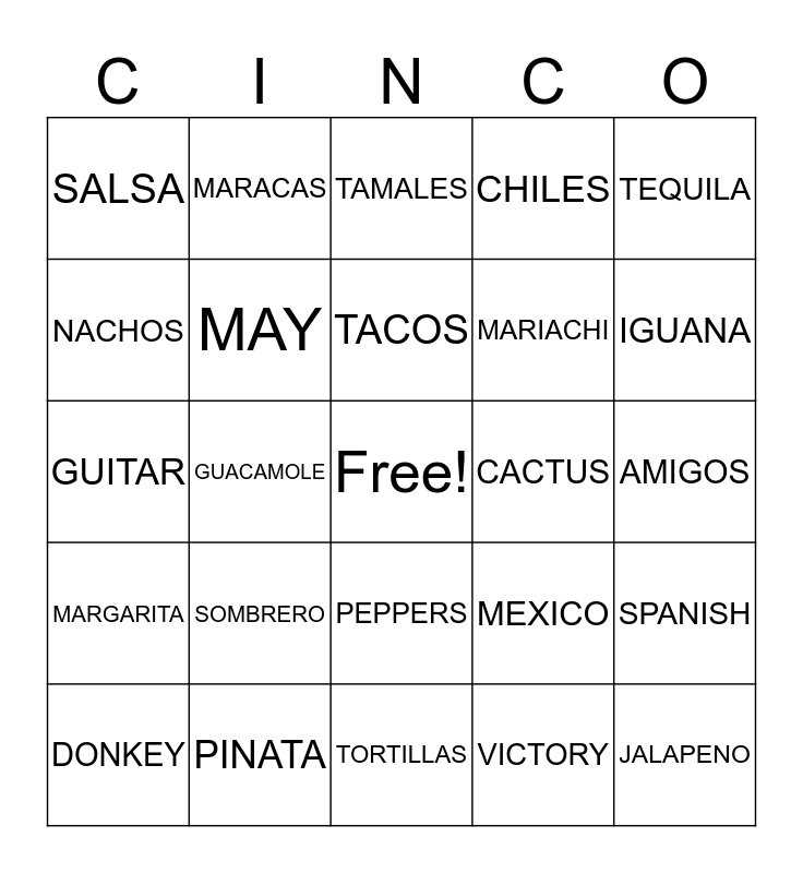 This bingo card has a free space and 24 words: SOMBRERO, PINATA, TACOS, DONKEY, TEQUILA, SALSA, NACHOS, MARACAS, CACTUS, PEPPERS, MARIACHI, GUITAR, MEXICO, SPANISH, MAY, VICTORY, AMIGOS, TAMALES, IGUANA, GUACAMOLE, JALAPENO, MARGARITA, CHILES and TORTILLAS.