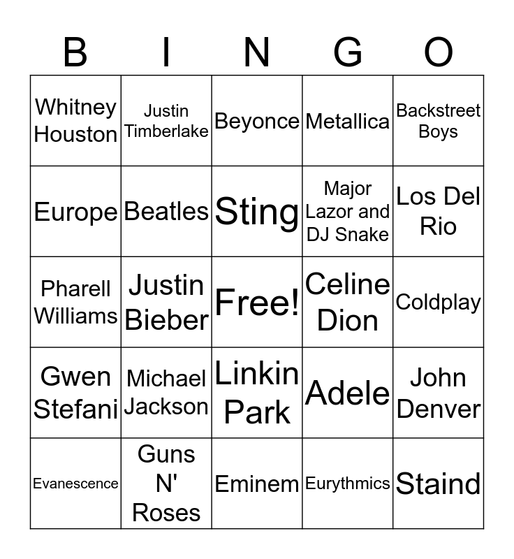 This bingo card has a free space and 24 words: Michael Jackson, Guns N' Roses, Sting, Evanescence, Backstreet Boys, Whitney Houston, Europe, Justin Timberlake, Celine Dion, Linkin Park, Major Lazor and DJ Snake, Pharell Williams, Adele, John Denver, Beatles, Eurythmics, Coldplay, Beyonce, Los Del Rio, Justin Bieber, Staind, Gwen Stefani, Metallica and Eminem.