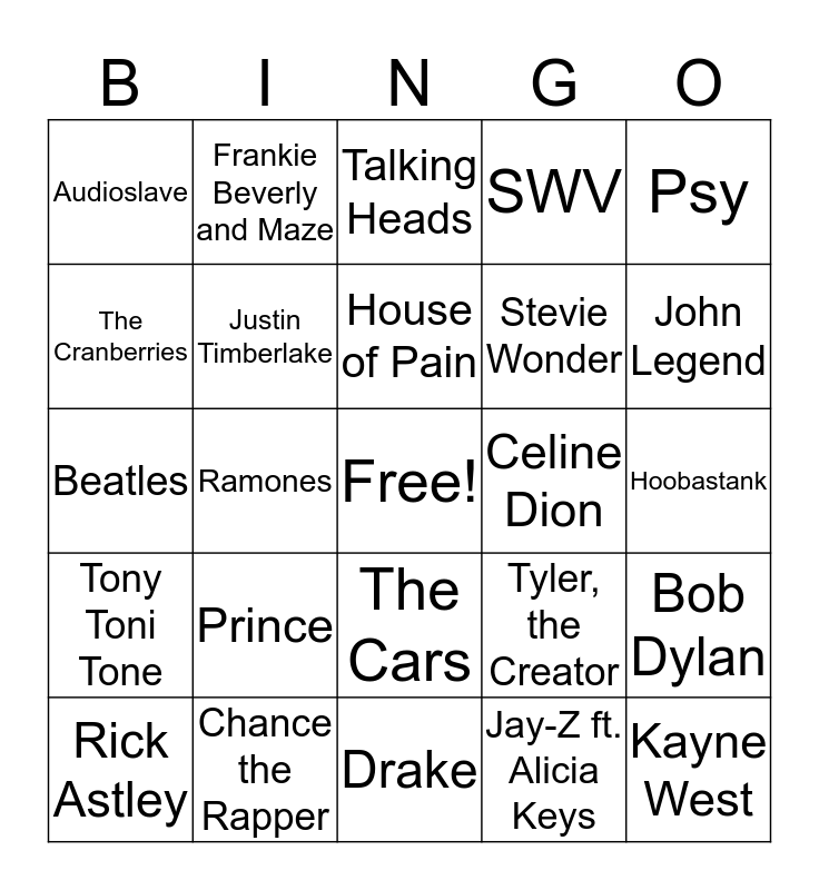 This bingo card has a free space and 24 words: Prince, Chance the Rapper, House of Pain, Rick Astley, Psy, Audioslave, The Cranberries, Frankie Beverly and Maze, Celine Dion, The Cars, Stevie Wonder, Beatles, Tyler, the Creator, Bob Dylan, Justin Timberlake, Jay-Z ft. Alicia Keys, Hoobastank, Talking Heads, John Legend, Ramones, Kayne West, Tony Toni Tone, SWV and Drake.